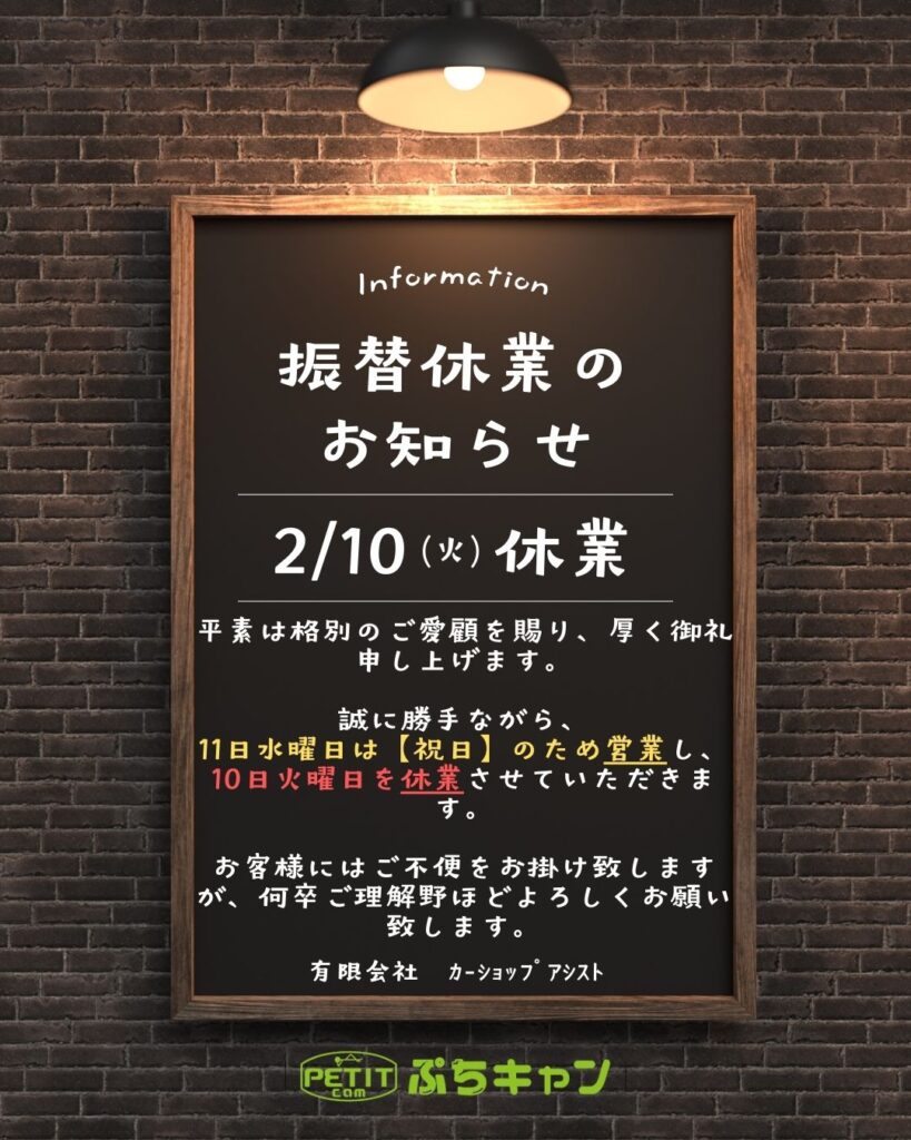 2月11日(水)が祝日の為、2月10日(火)を休日とさせていただきます。なお、2月11日(水)は通常営業いたします!!ご不便をおかけしますが、よろしくお願いいたします。
